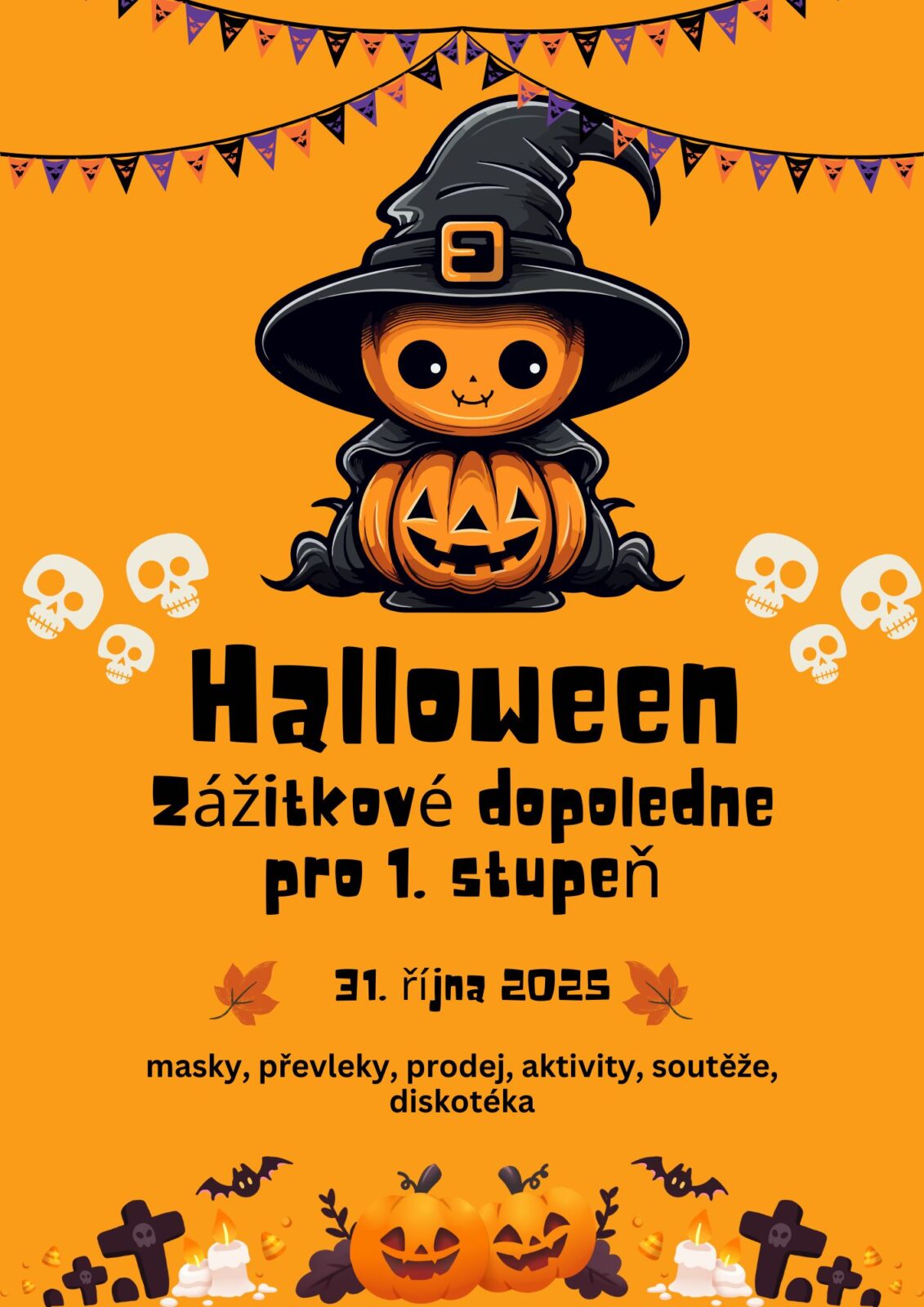 V pátek 31. 10. se žáci 1. stupně mohou těšit na společně strávený den plný zábavy a strašidelných zážitků. Děti přijdou v kostýmech, mohou potěšit ostatní prodejem halloweenských dobrůtek, dekorací a překvapení. Nebude chybět ani malá diskotéka v tělocvičně.