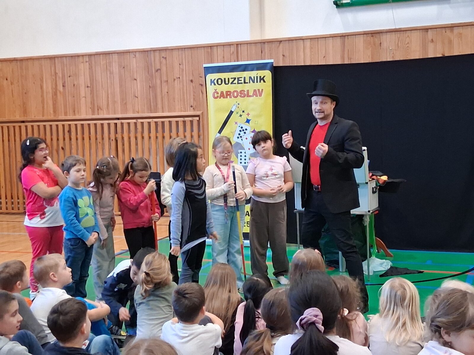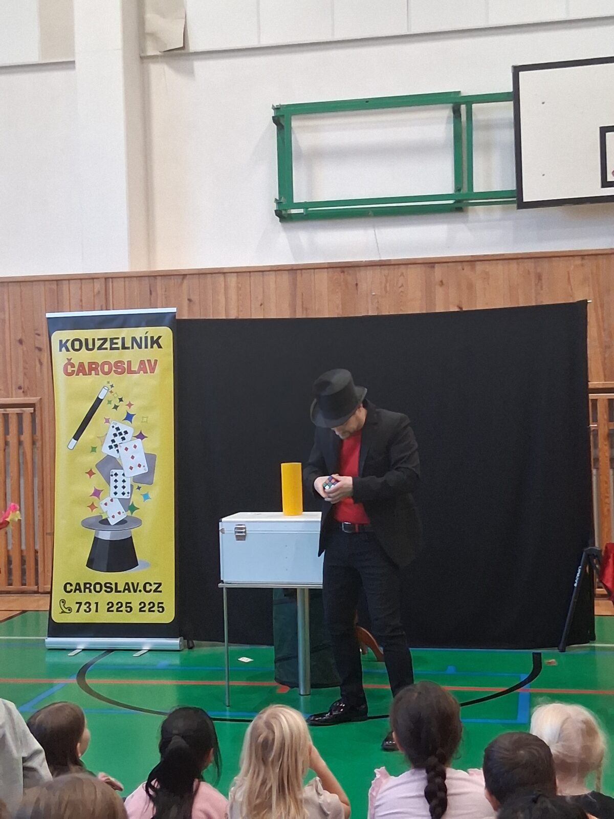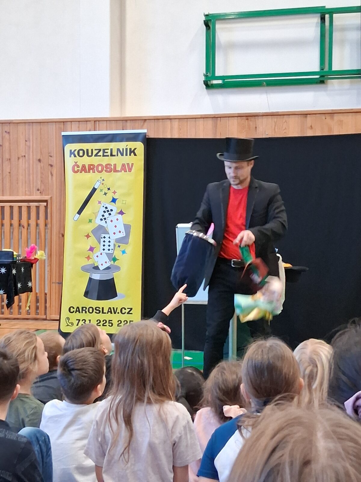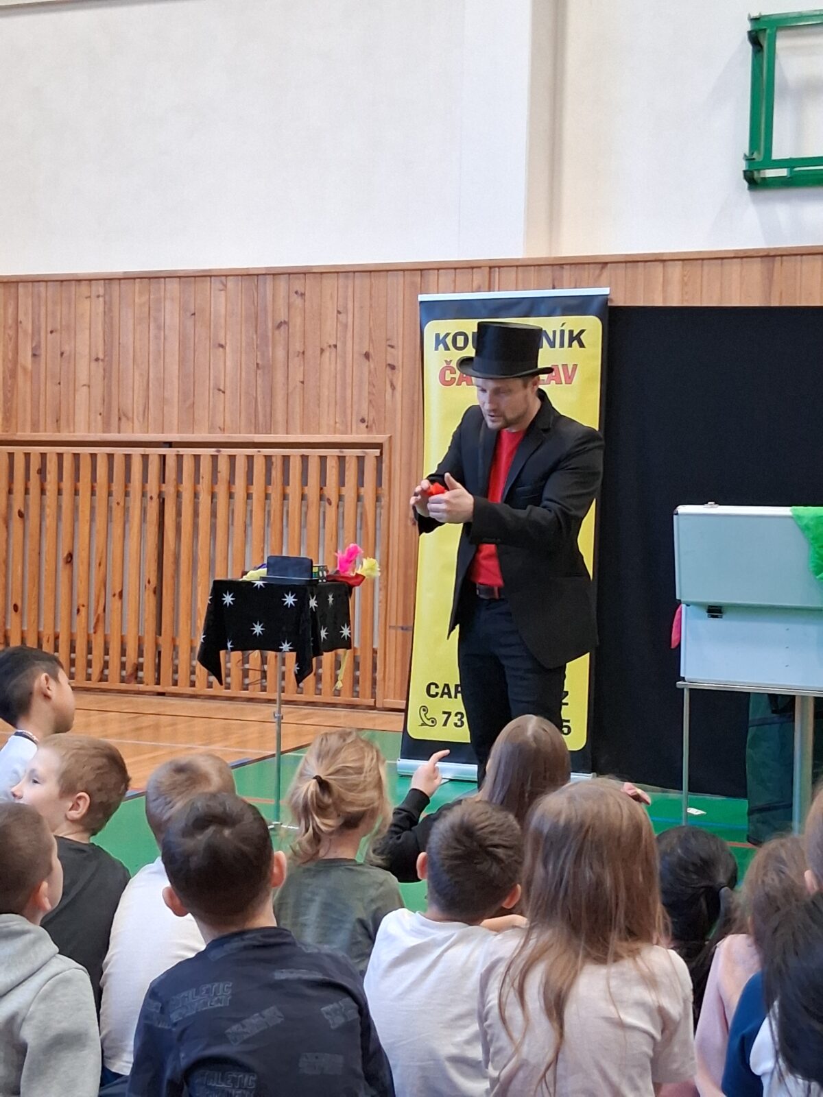 V pátek 12. prosince naši školní družinu navštívil kouzelník Čaroslav. Kouzelník si připravil pestrý program plný překvapení, veselých triků a zábavných momentů. Děti s nadšením sledovaly jeho kouzla s kartami, šátky a kouzelnickou hůlkou. Do některých triků se mohly samy zapojit což vyvolalo spoustu smíchu i bouřlivý potlesk.