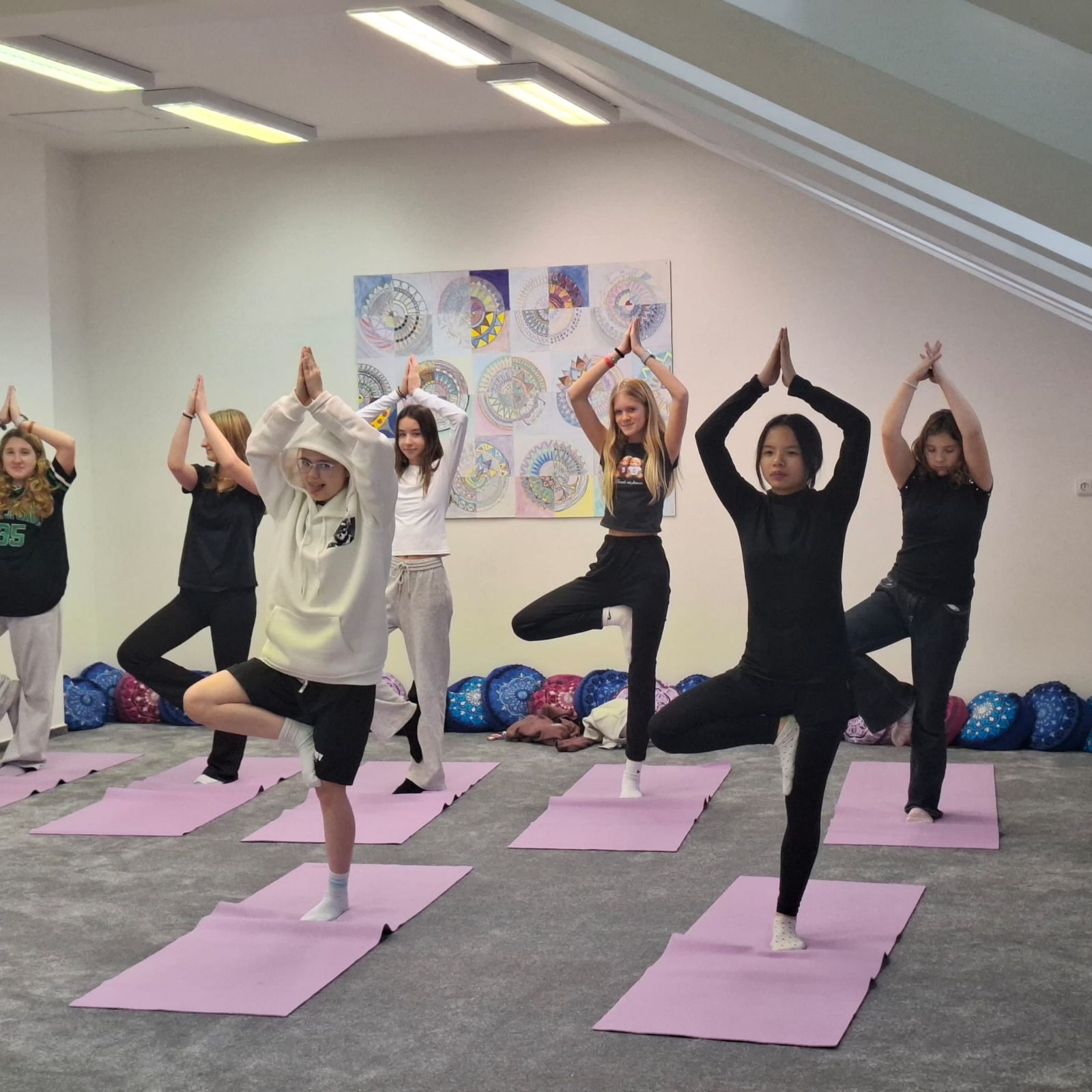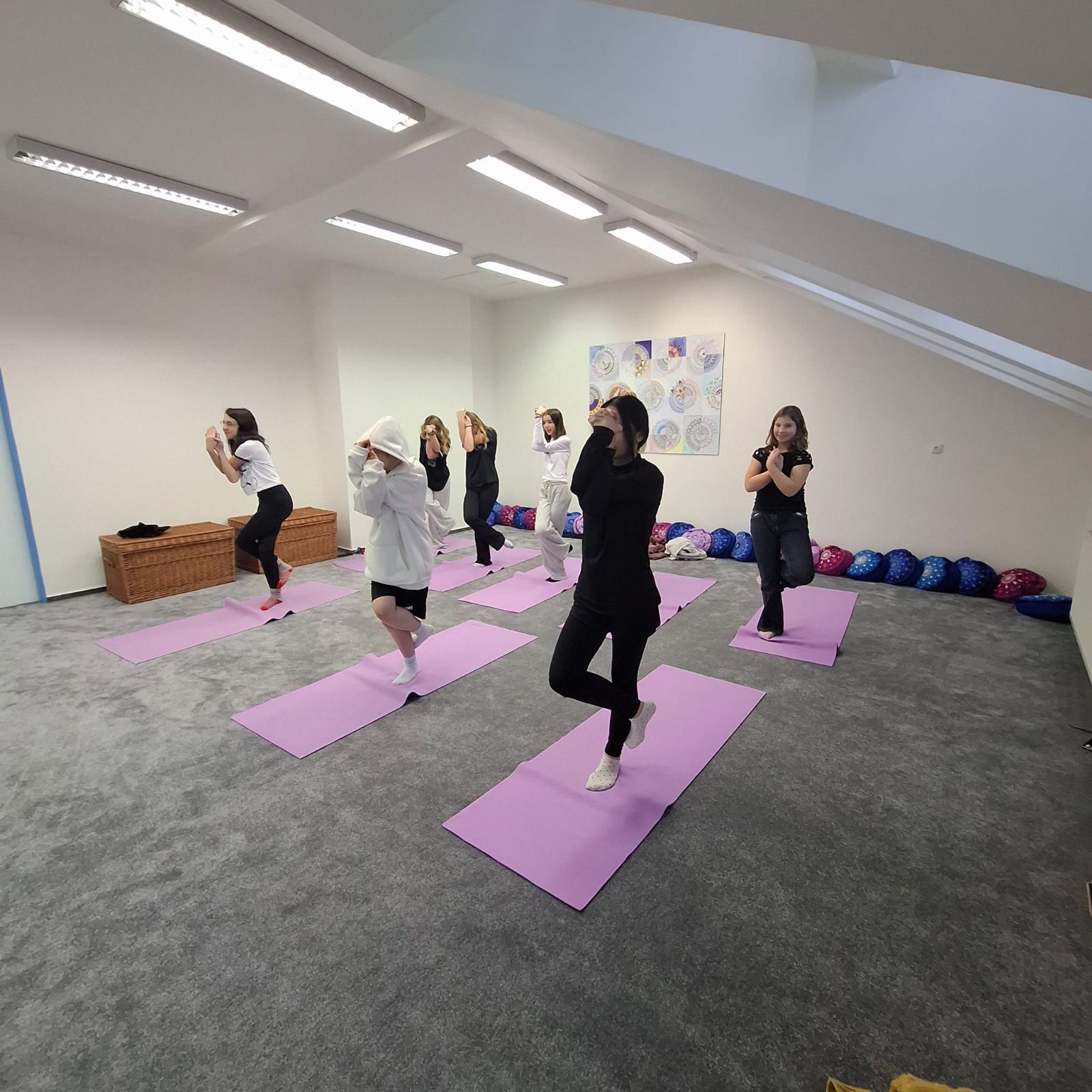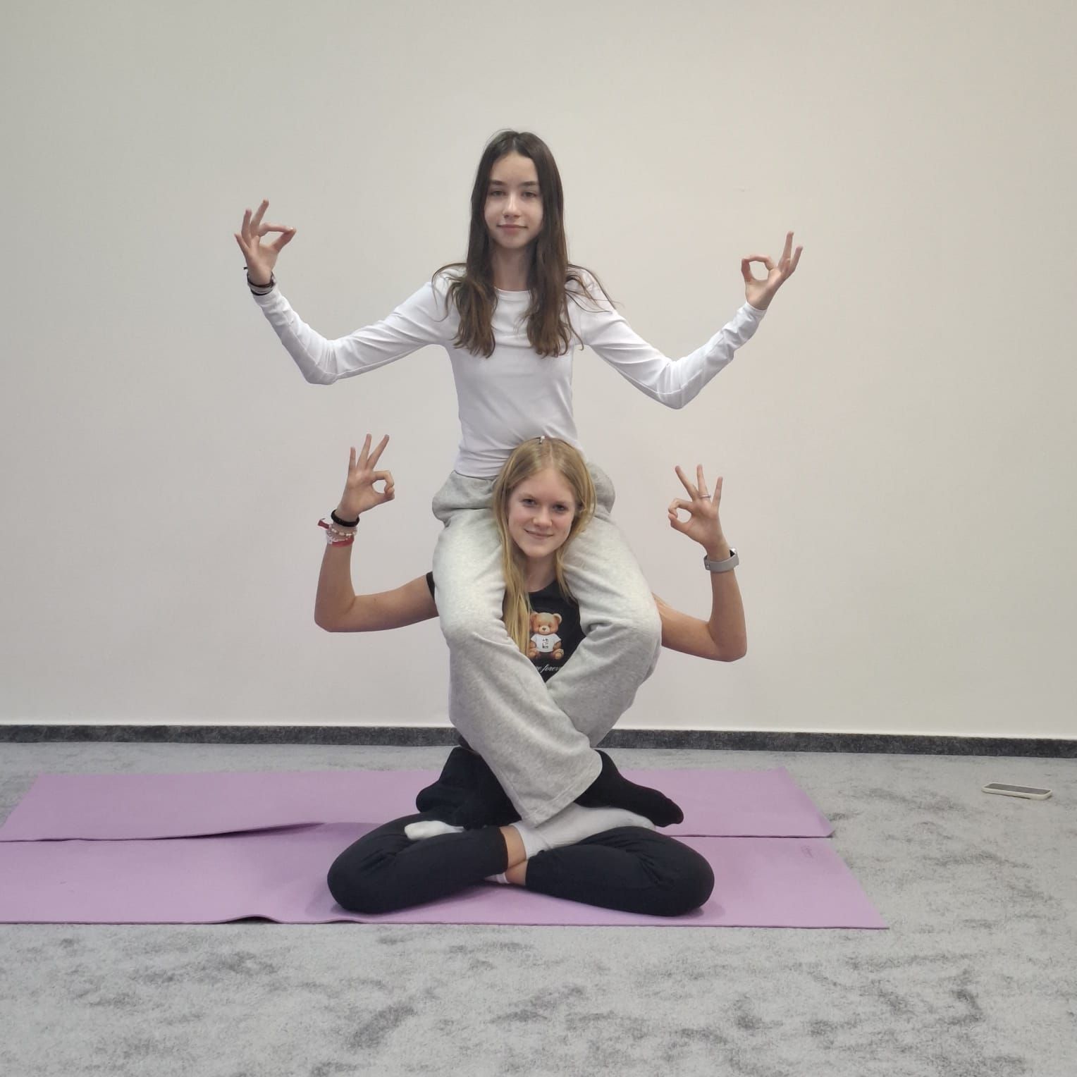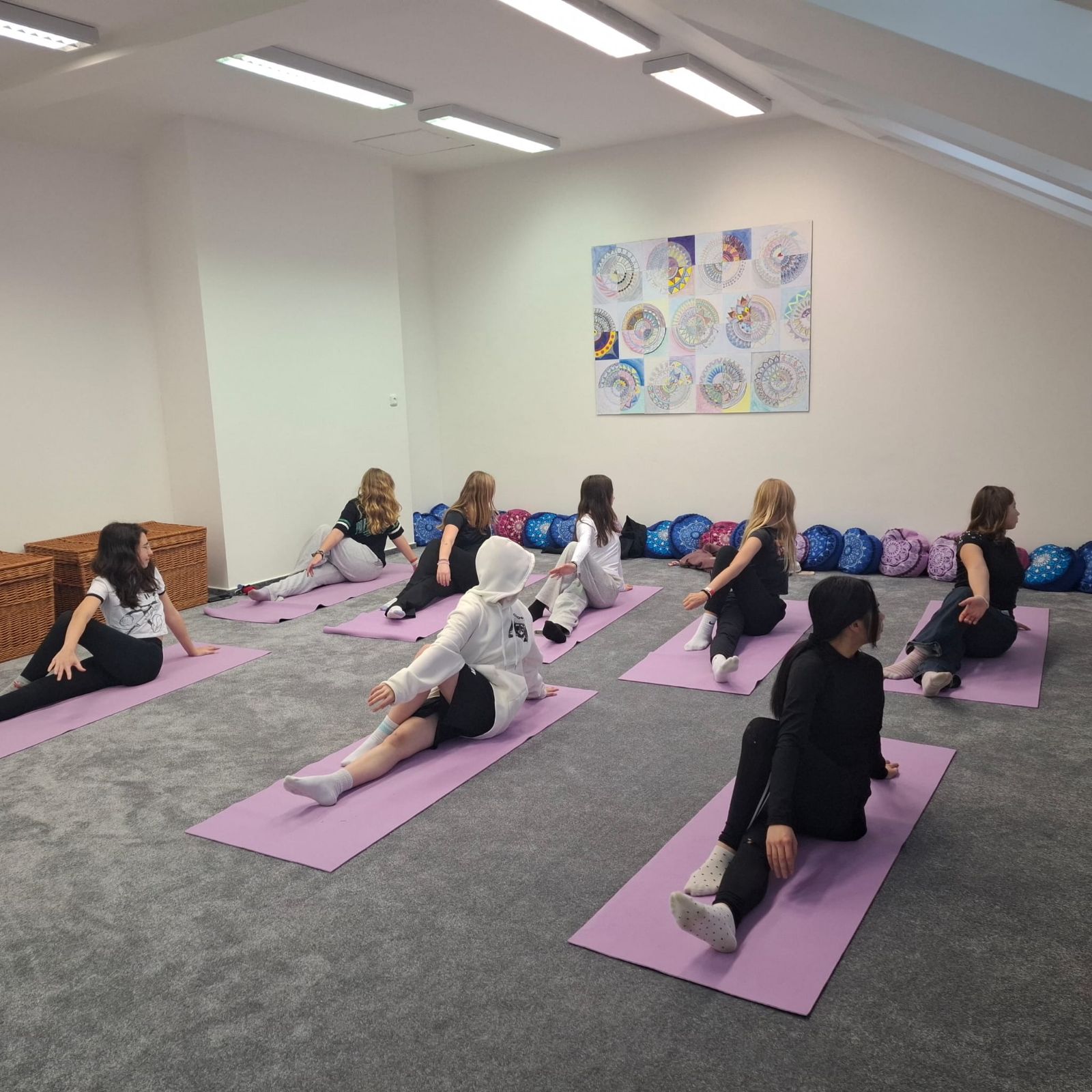Od září tohoto školního roku funguje na druhém stupni naší školy kroužek jógy pro dívky, který nabízí prostor ke zklidnění, protažení těla i uvolnění mysli. Během lekcí se dívky seznamují se základními jógovými pozicemi, dechovými cvičeními, relaxací i hravými pohybovými aktivitami podporujícími soustředění a spolupráci. Velmi oblíbená je i jóga ve dvojicích.