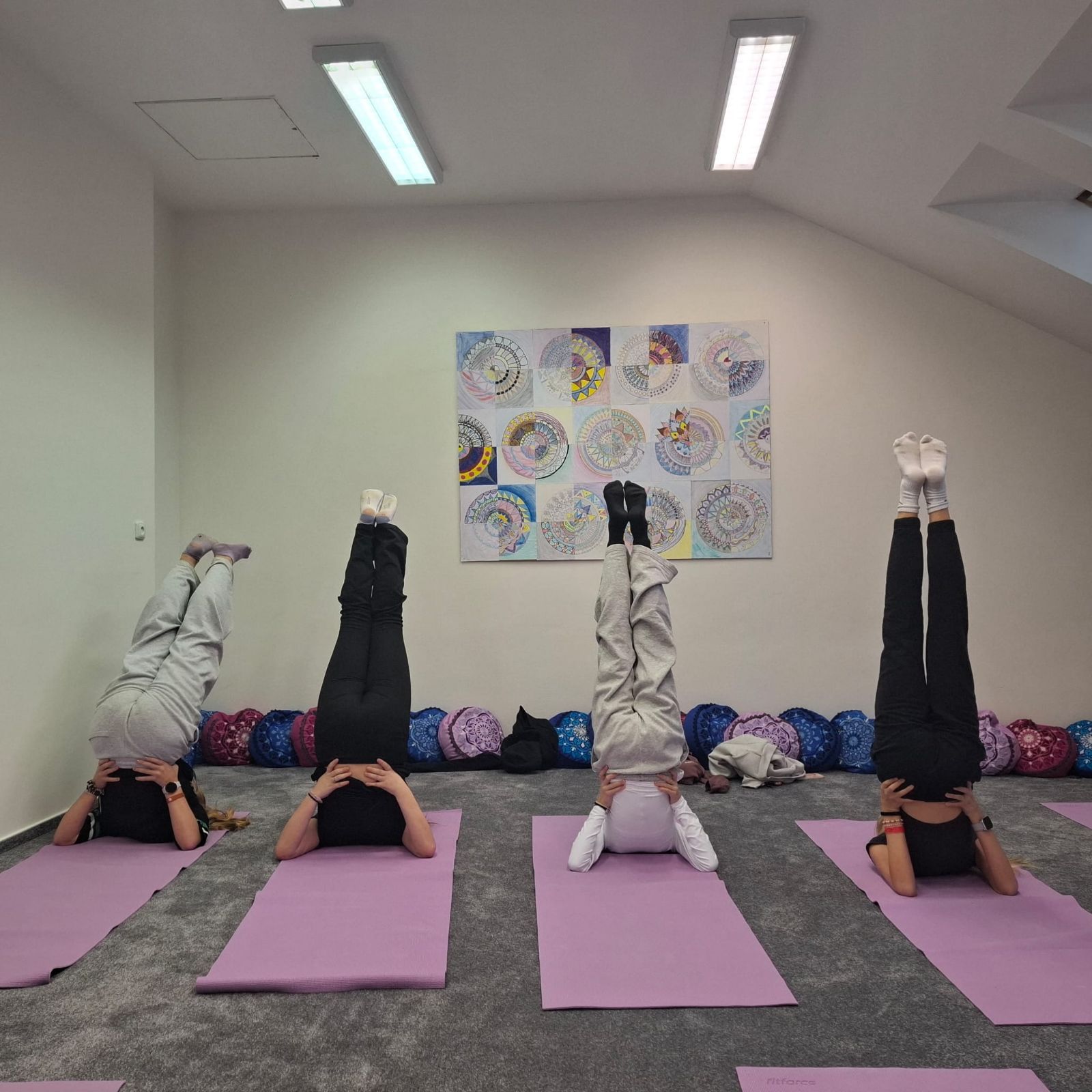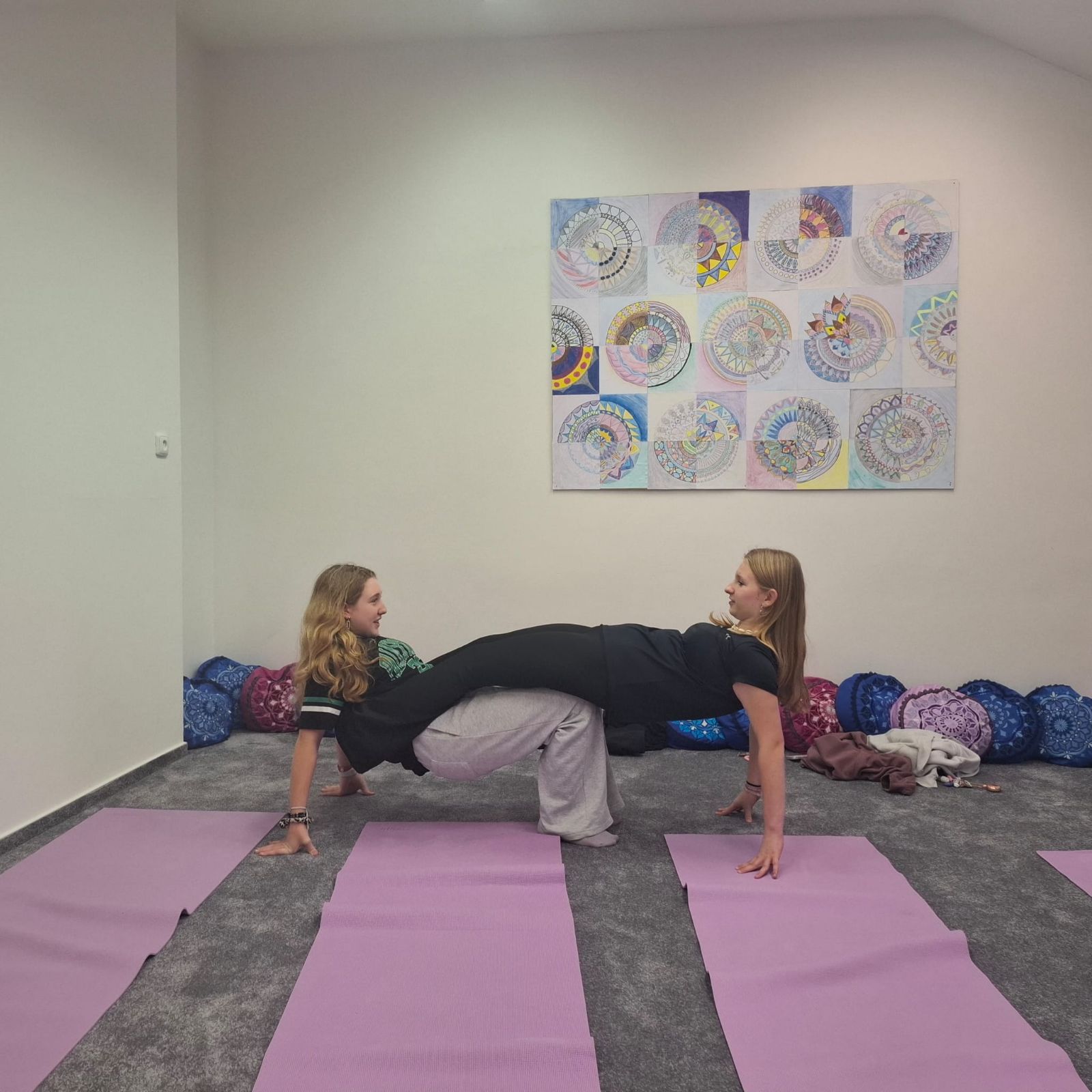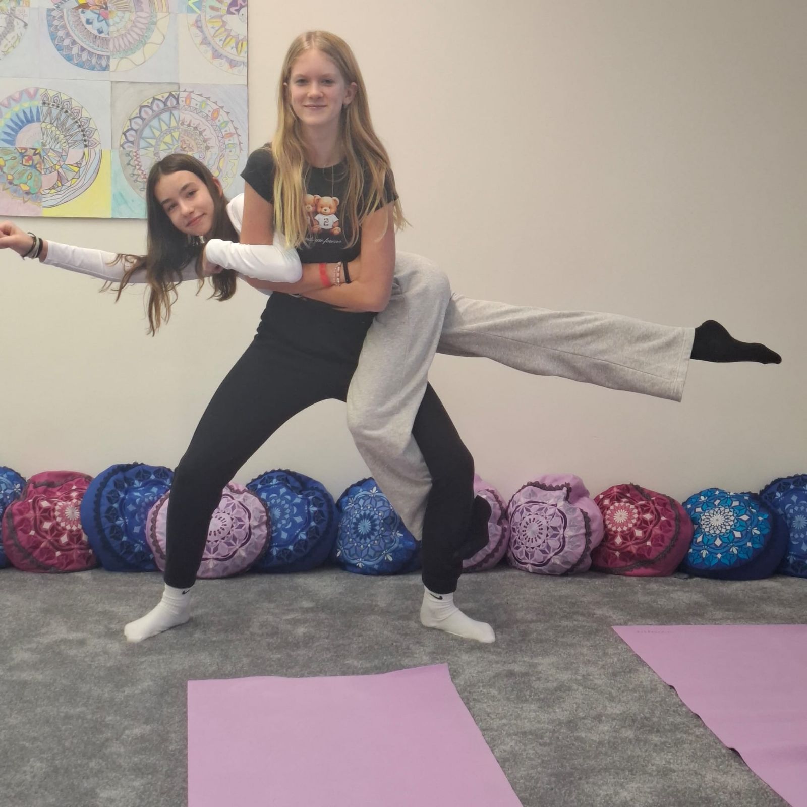 Od září tohoto školního roku funguje na druhém stupni naší školy kroužek jógy pro dívky, který nabízí prostor ke zklidnění, protažení těla i uvolnění mysli. Během lekcí se dívky seznamují se základními jógovými pozicemi, dechovými cvičeními, relaxací i hravými pohybovými aktivitami podporujícími soustředění a spolupráci. Velmi oblíbená je i jóga ve dvojicích.