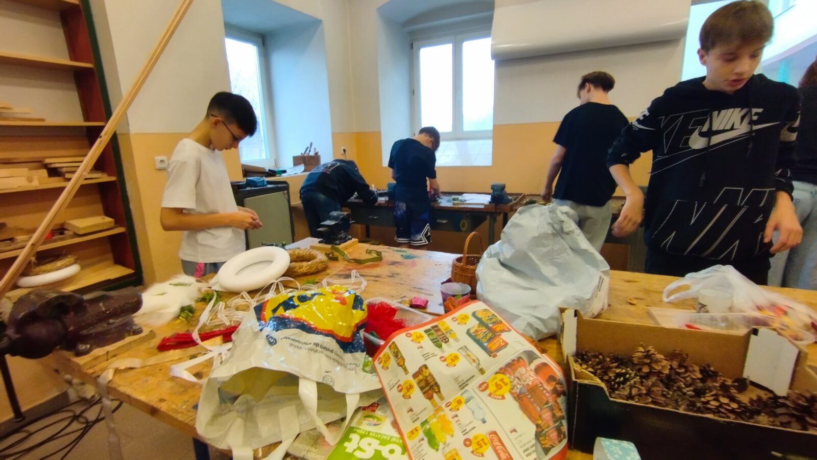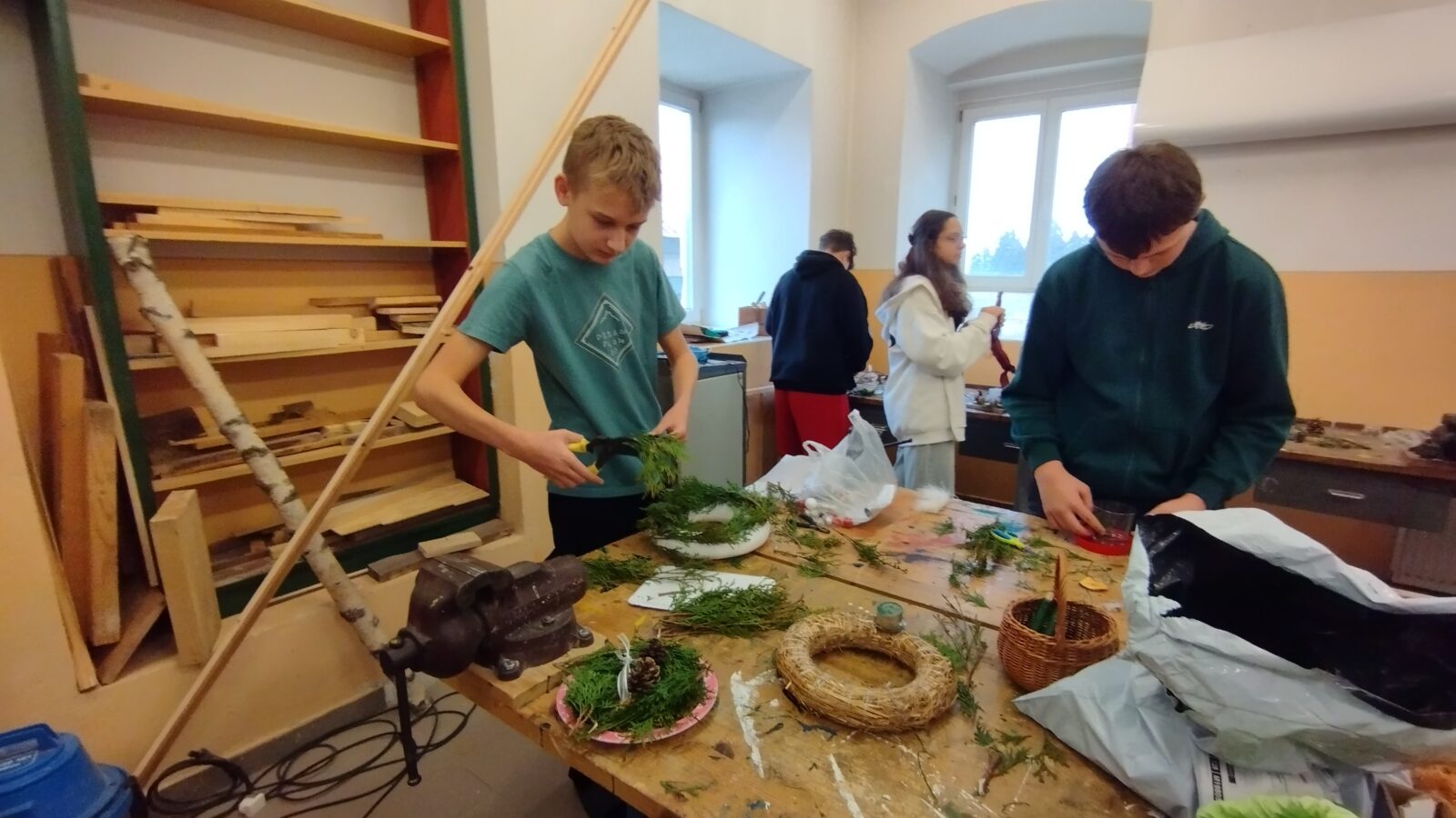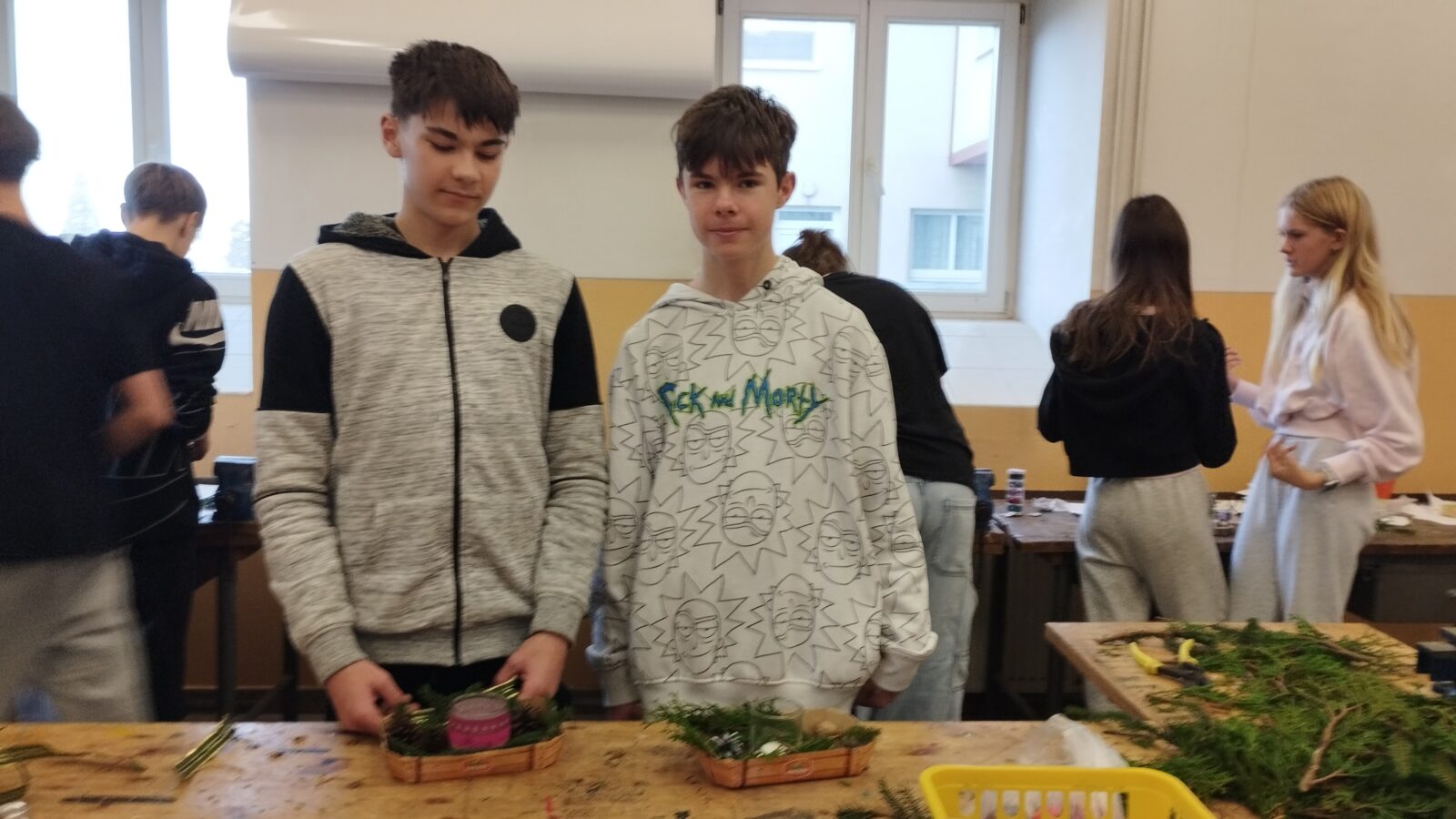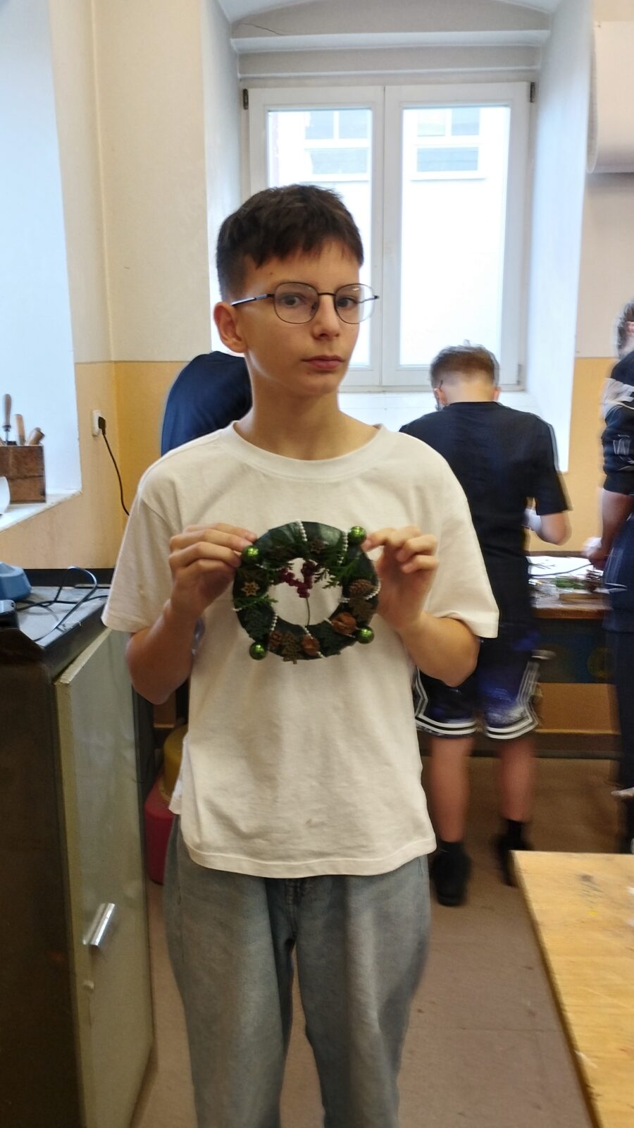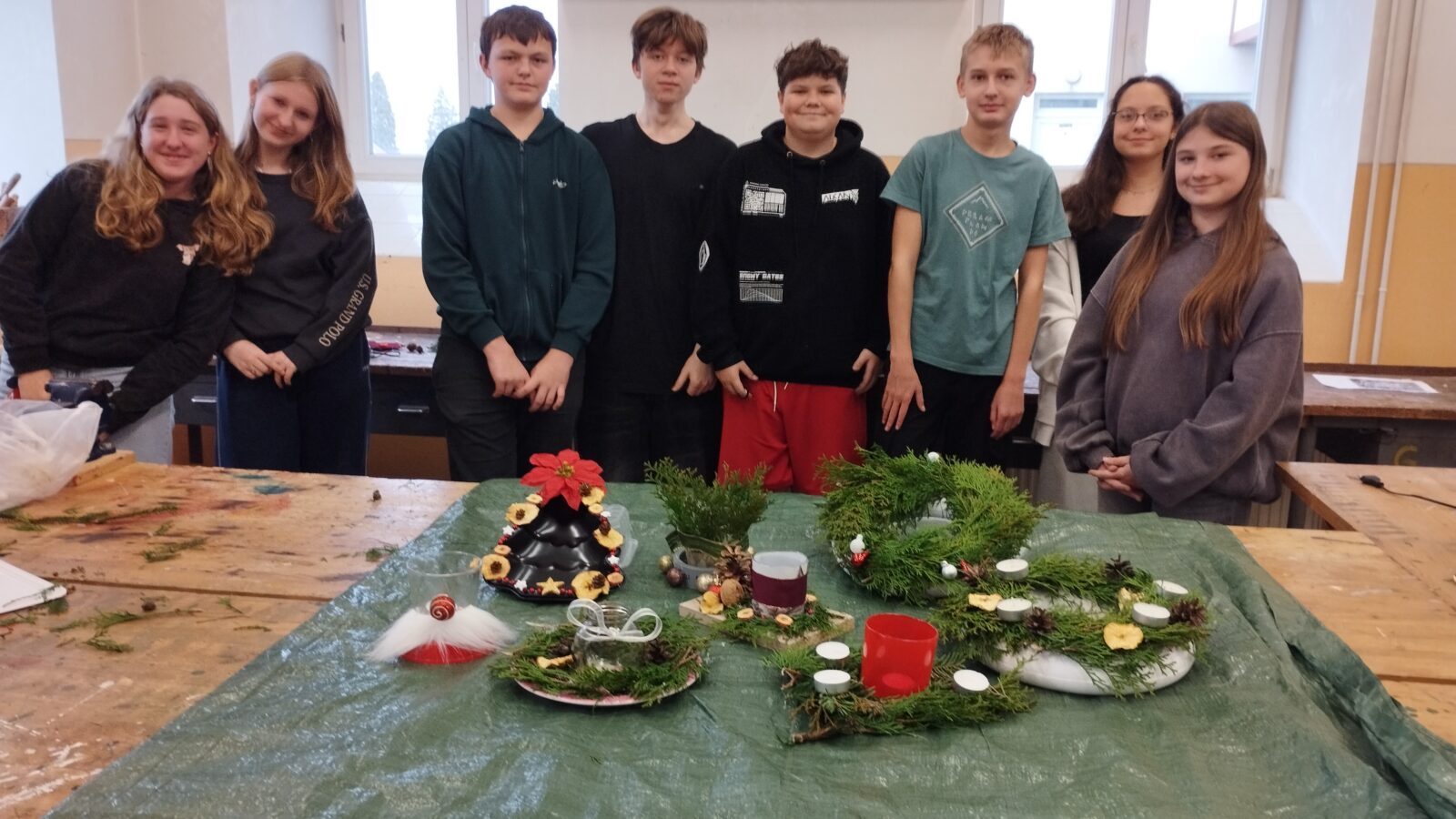 Také žáci 8.B se pustili do výroby vlastních vánočních dekorací. Pracovali s přírodními i recyklovanými materiály. Pod jejich rukama vznikaly originální věnce, svícny apod. Žáci si navzájem pomáhali, sdíleli nápady a užívali si příjemnou předvánoční atmosféru.