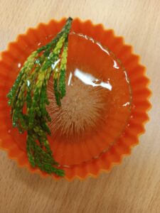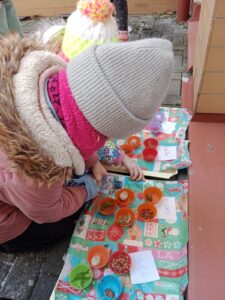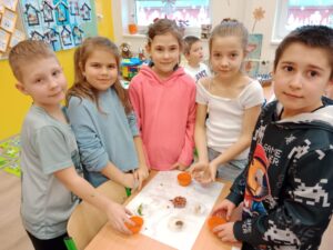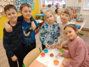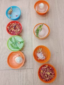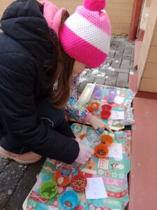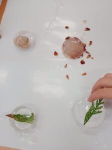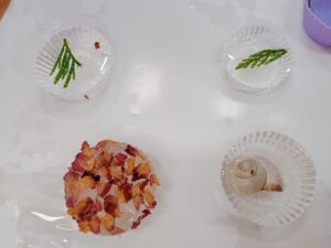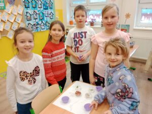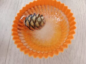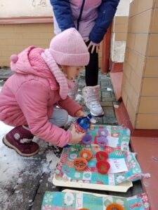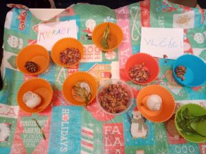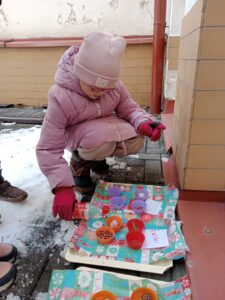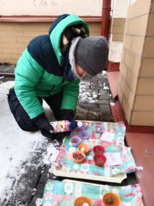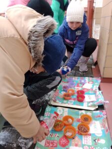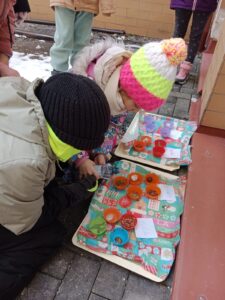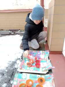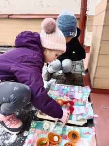 Využili jsme mrazivého počasí, abychom ověřili, že voda mění své skupenství. Nejdříve si děti daly do formiček různé drobnosti, venku zalily vodou a čekaly. Druhý den bylo „mrazivě upečeno“. Mráz vykonal svou práci a děti mohly s nadšením sledovat výsledek – pevné ledové tvary s krásnými detaily uvnitř. Zimní počasí nabízí skvělé příležitosti k učení i zábavě zároveň.
