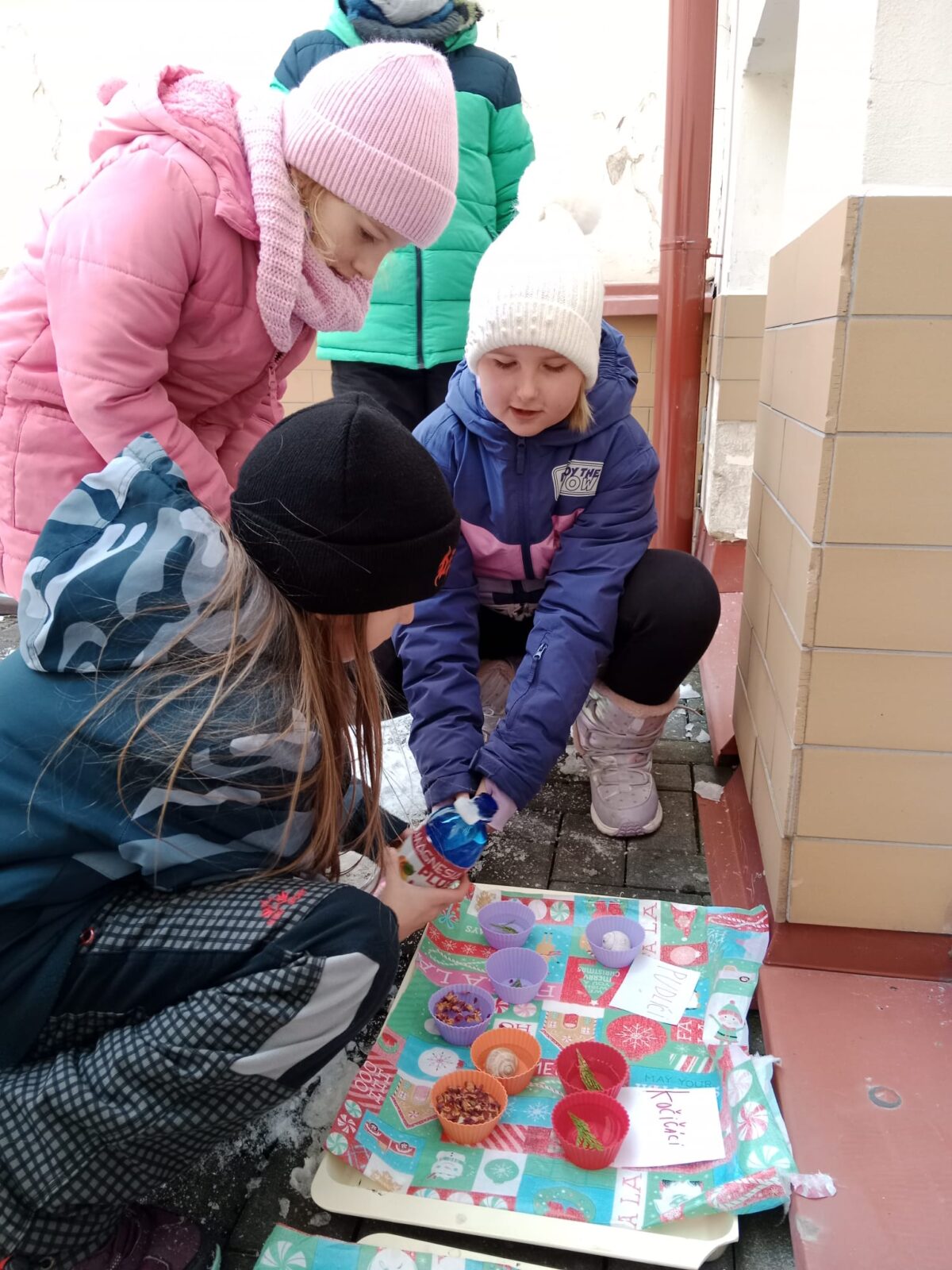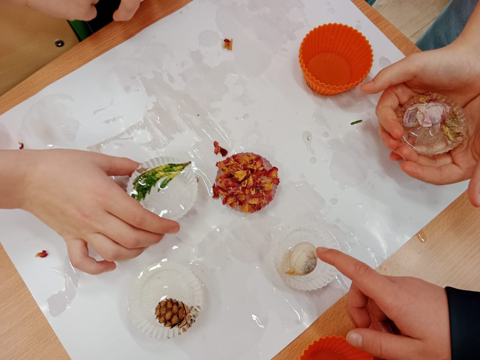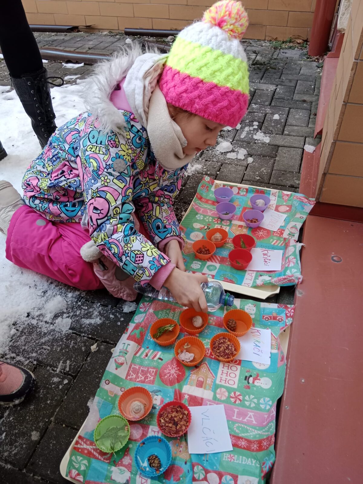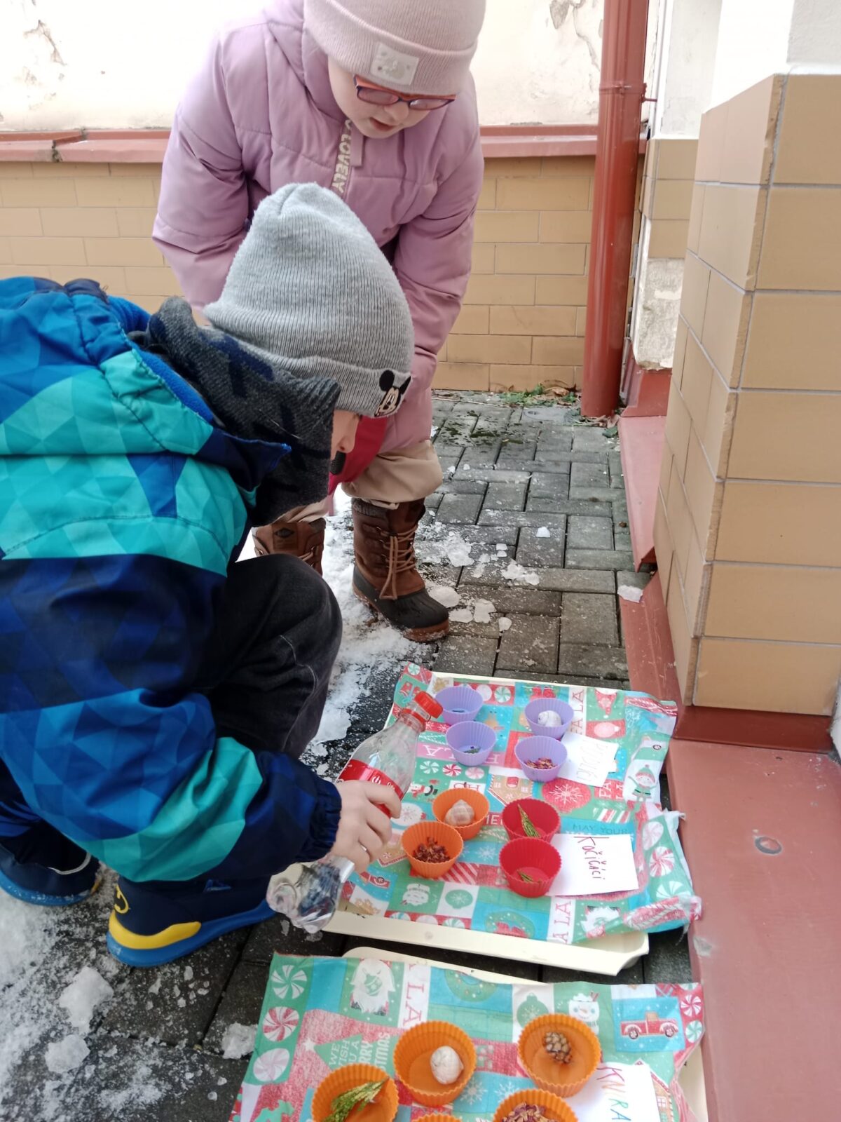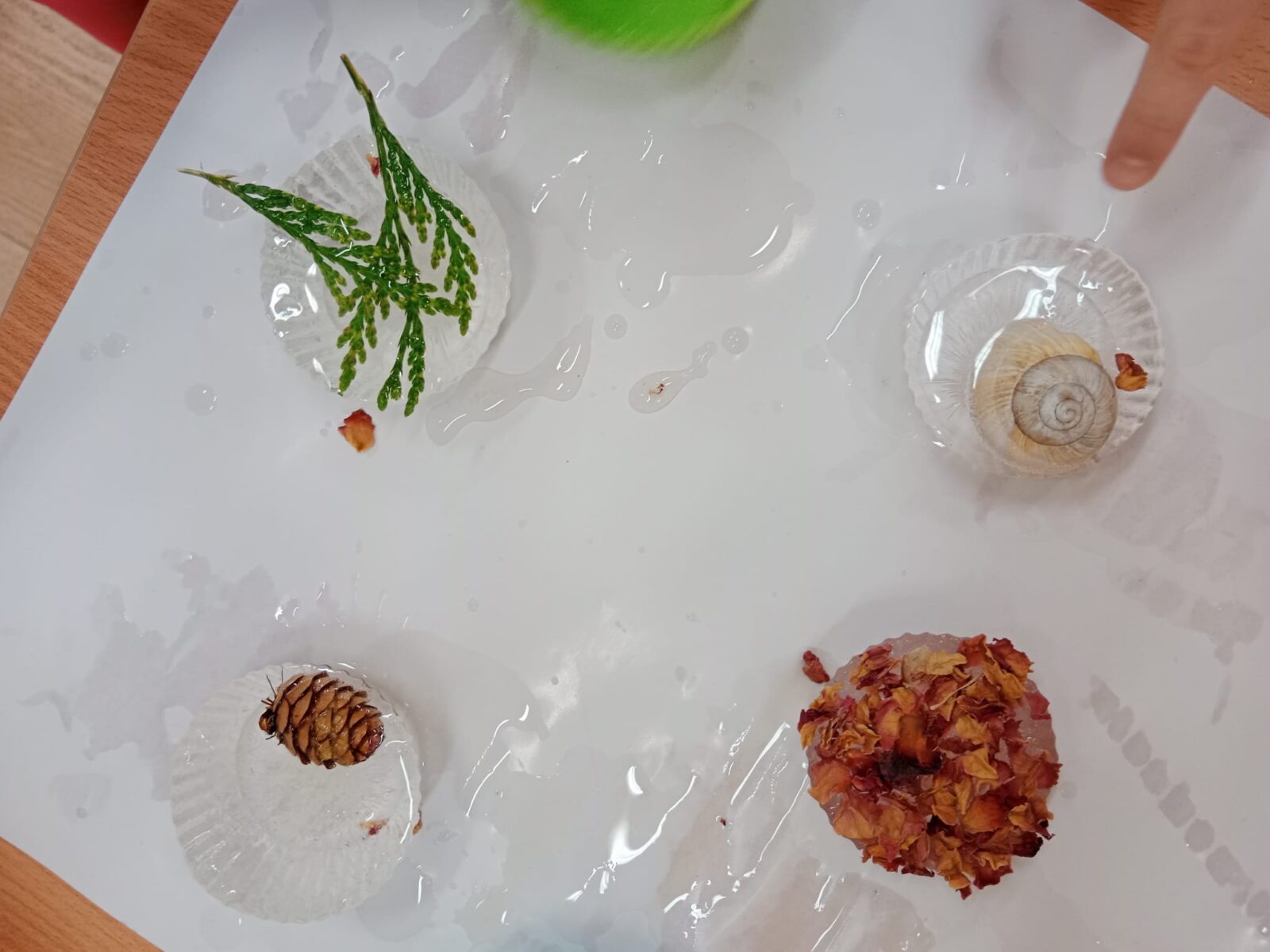 Využili jsme mrazivého počasí, abychom ověřili, že voda mění své skupenství. Nejdříve si děti daly do formiček různé drobnosti, venku zalily vodou a čekaly. Druhý den bylo „mrazivě upečeno“. Mráz vykonal svou práci a děti mohly s nadšením sledovat výsledek – pevné ledové tvary s krásnými detaily uvnitř. Zimní počasí nabízí skvělé příležitosti k učení i zábavě zároveň.