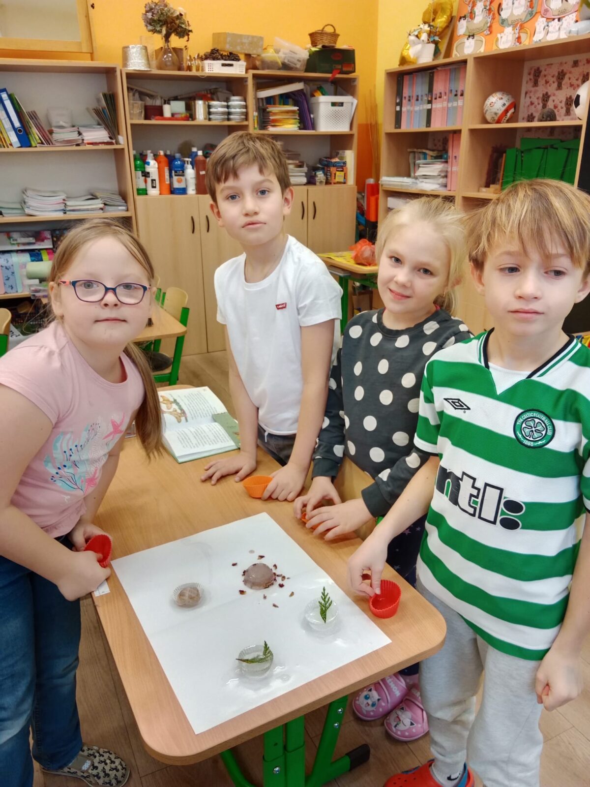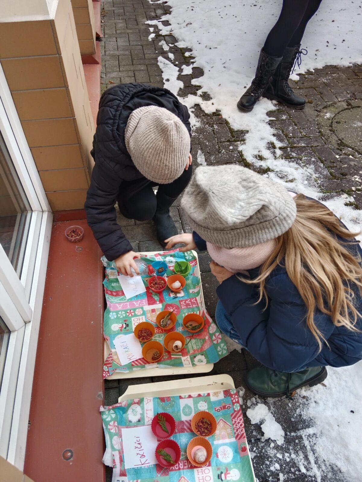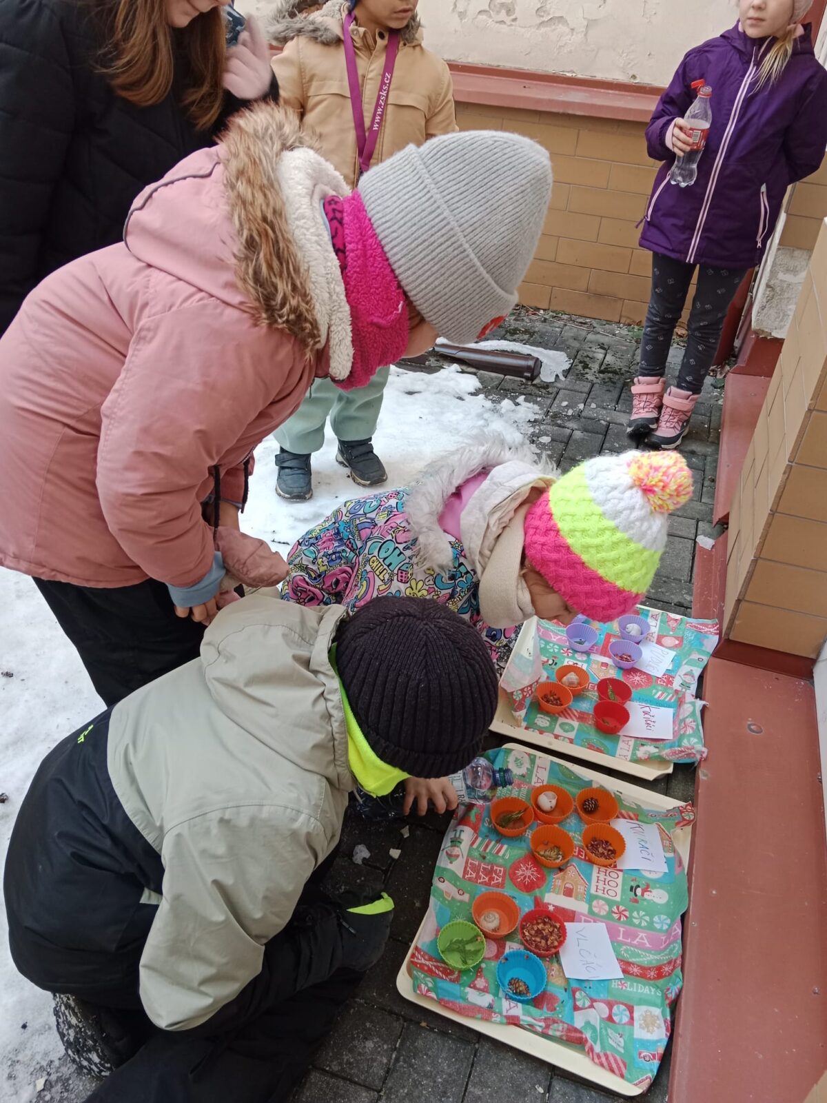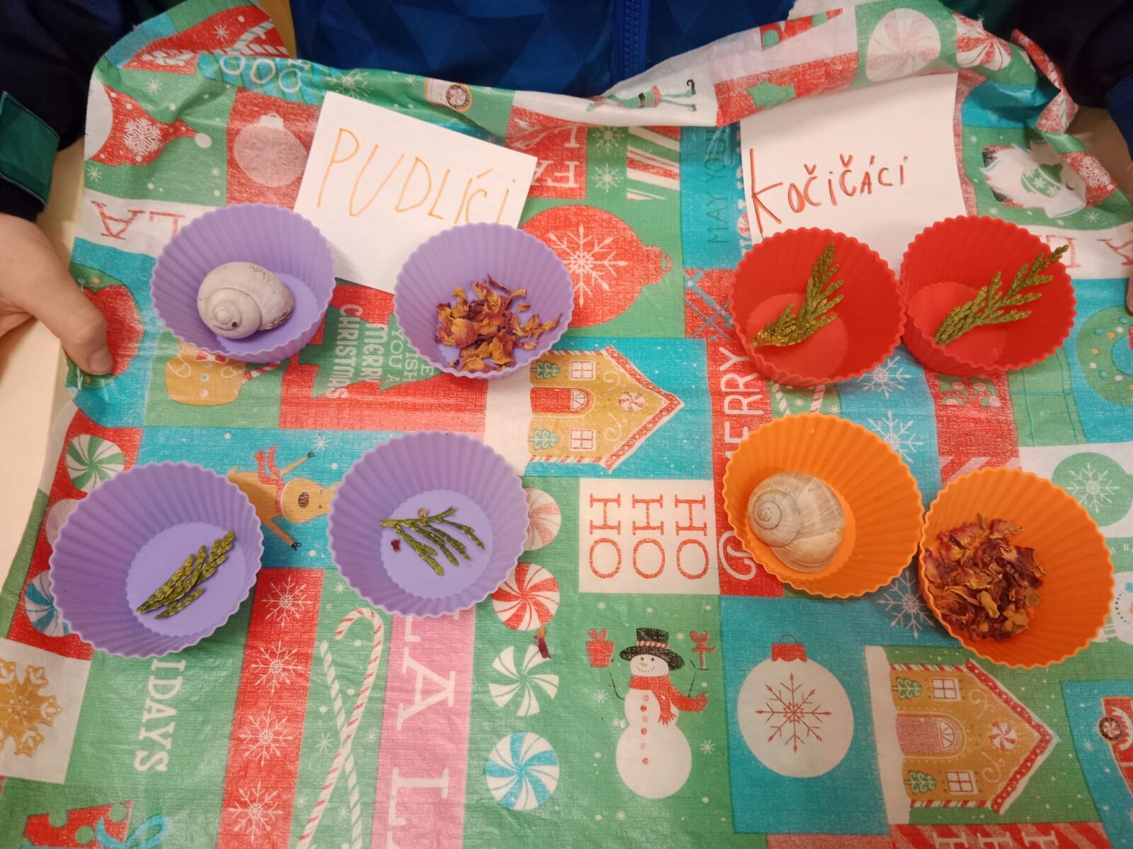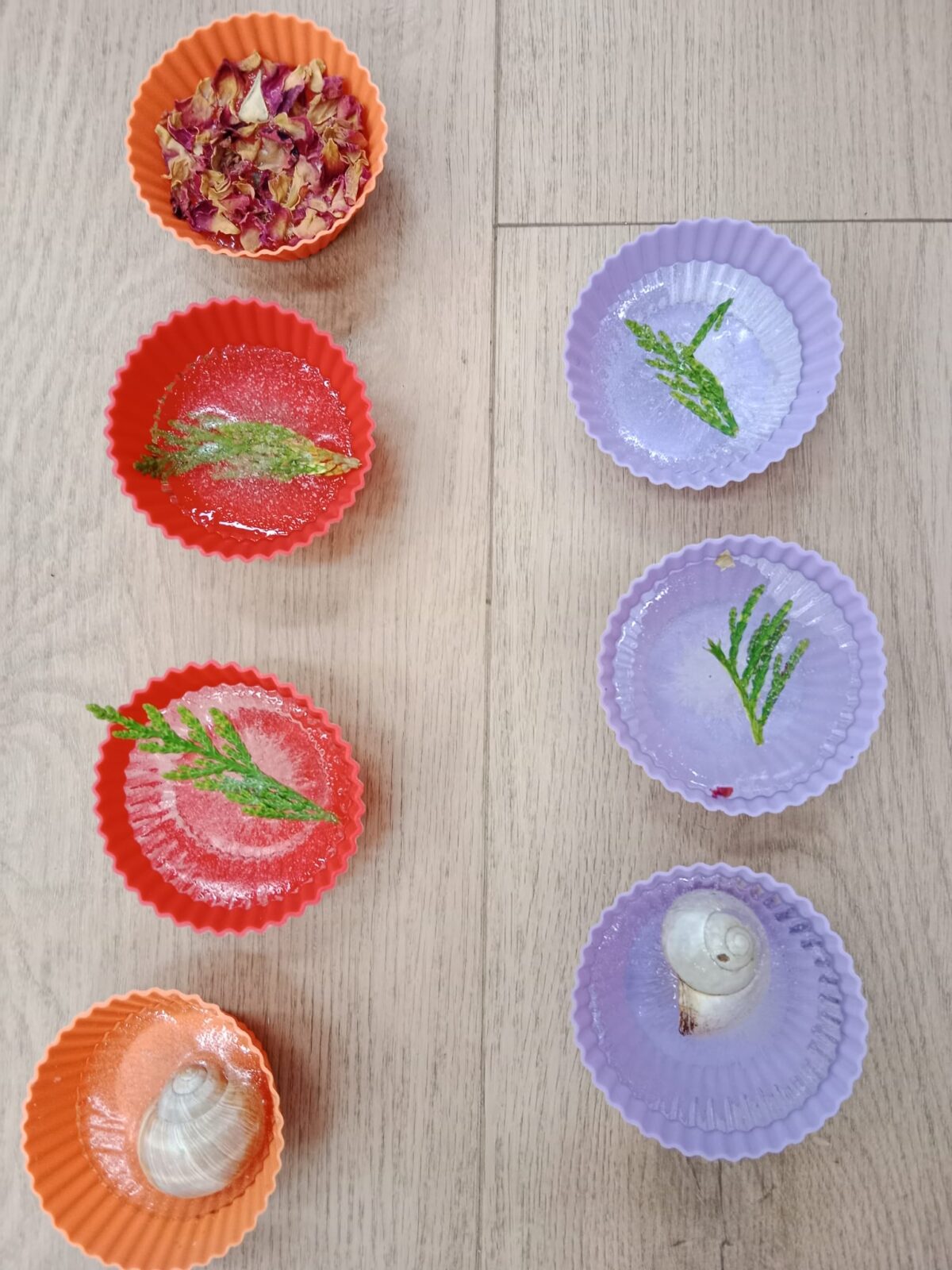 Využili jsme mrazivého počasí, abychom ověřili, že voda mění své skupenství. Nejdříve si děti daly do formiček různé drobnosti, venku zalily vodou a čekaly. Druhý den bylo „mrazivě upečeno“. Mráz vykonal svou práci a děti mohly s nadšením sledovat výsledek – pevné ledové tvary s krásnými detaily uvnitř. Zimní počasí nabízí skvělé příležitosti k učení i zábavě zároveň.